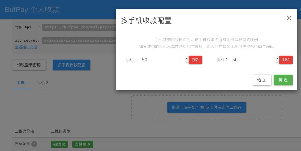 设置手机所占权重,分别为不同手机上传该手机上微信支付宝的收款二维码。