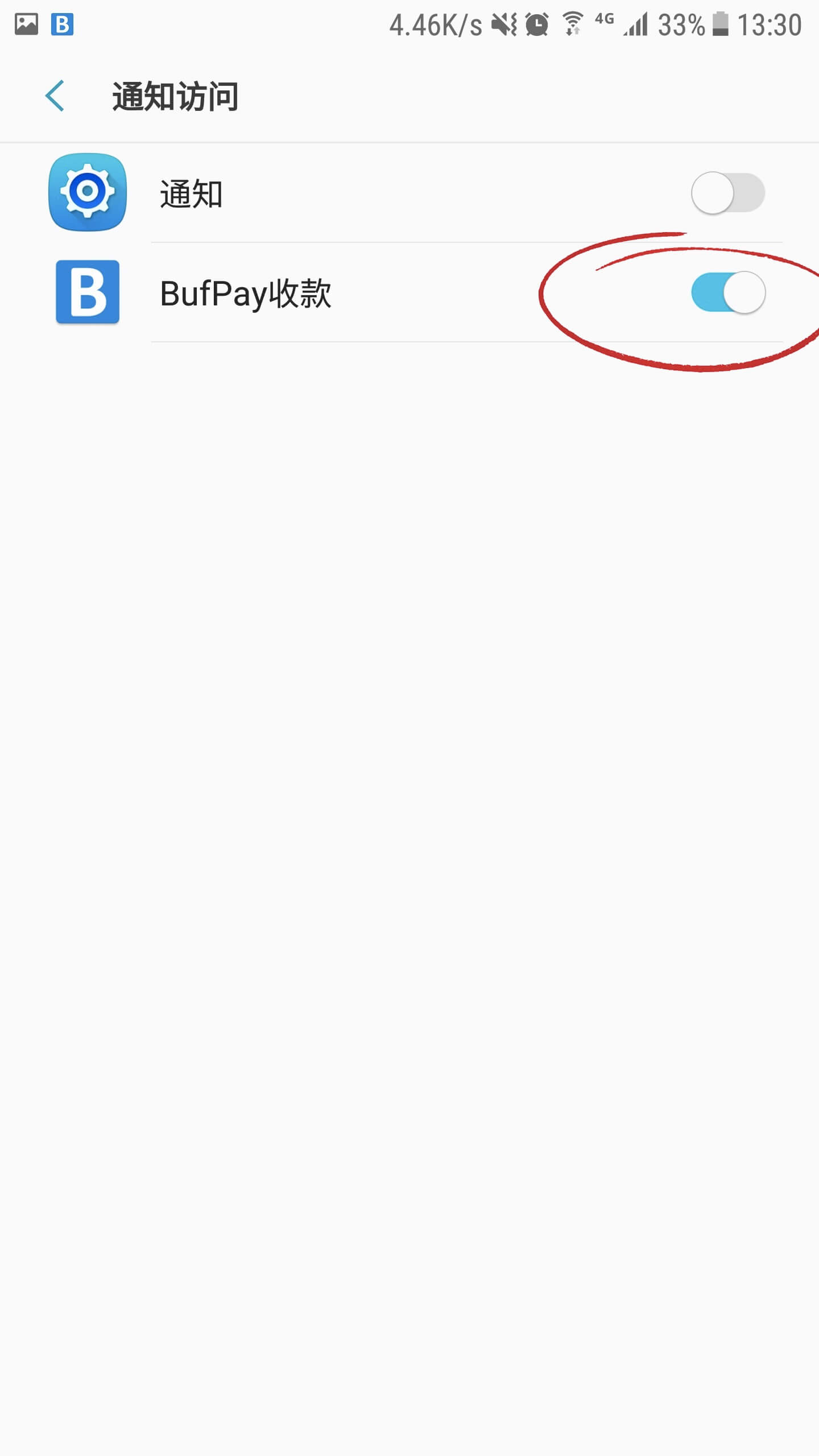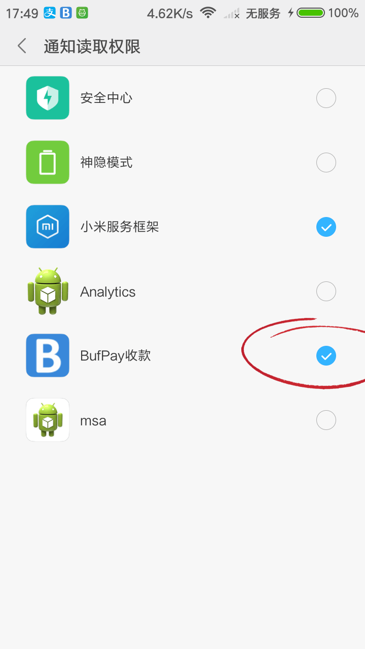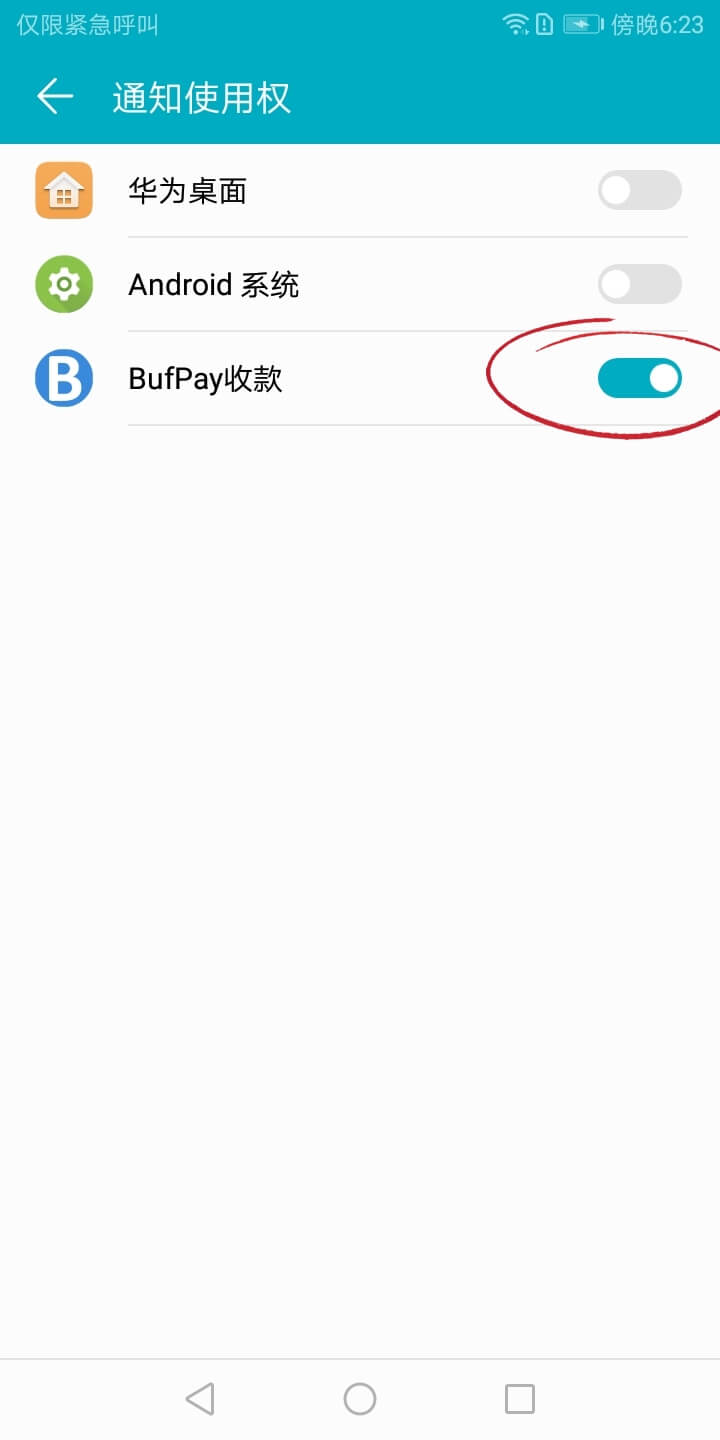 注意:必须开启 BufPay APP 的通知读取权限,否则无法读取支付通知。
