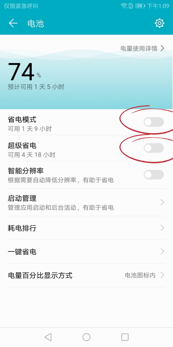 在系统「设置」-「电池」- 「省电模式」和「超级省电」- 点击关闭。