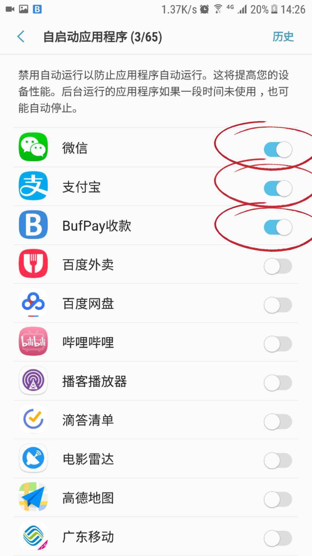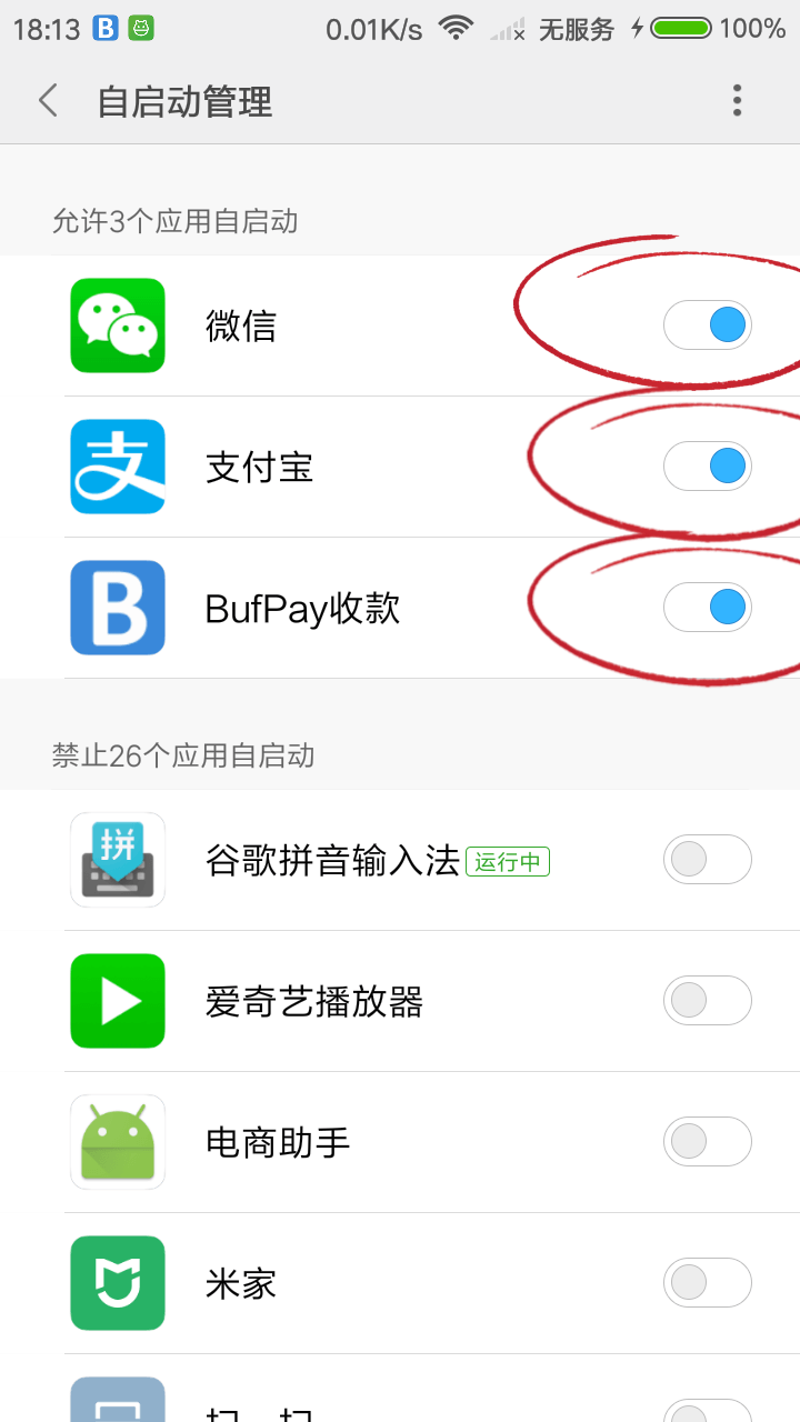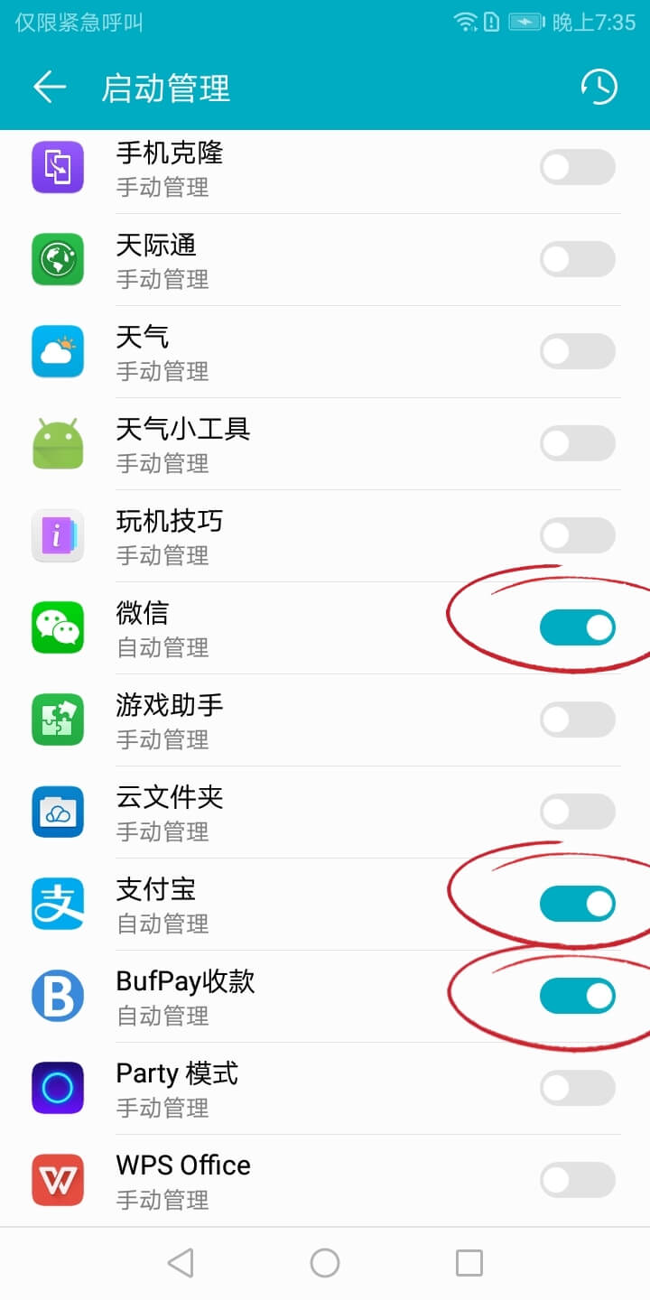 在系统「设置」-「授权管理」-「自启动管理」- 勾选 BufPay收款、微信、支付宝 允许自启动。