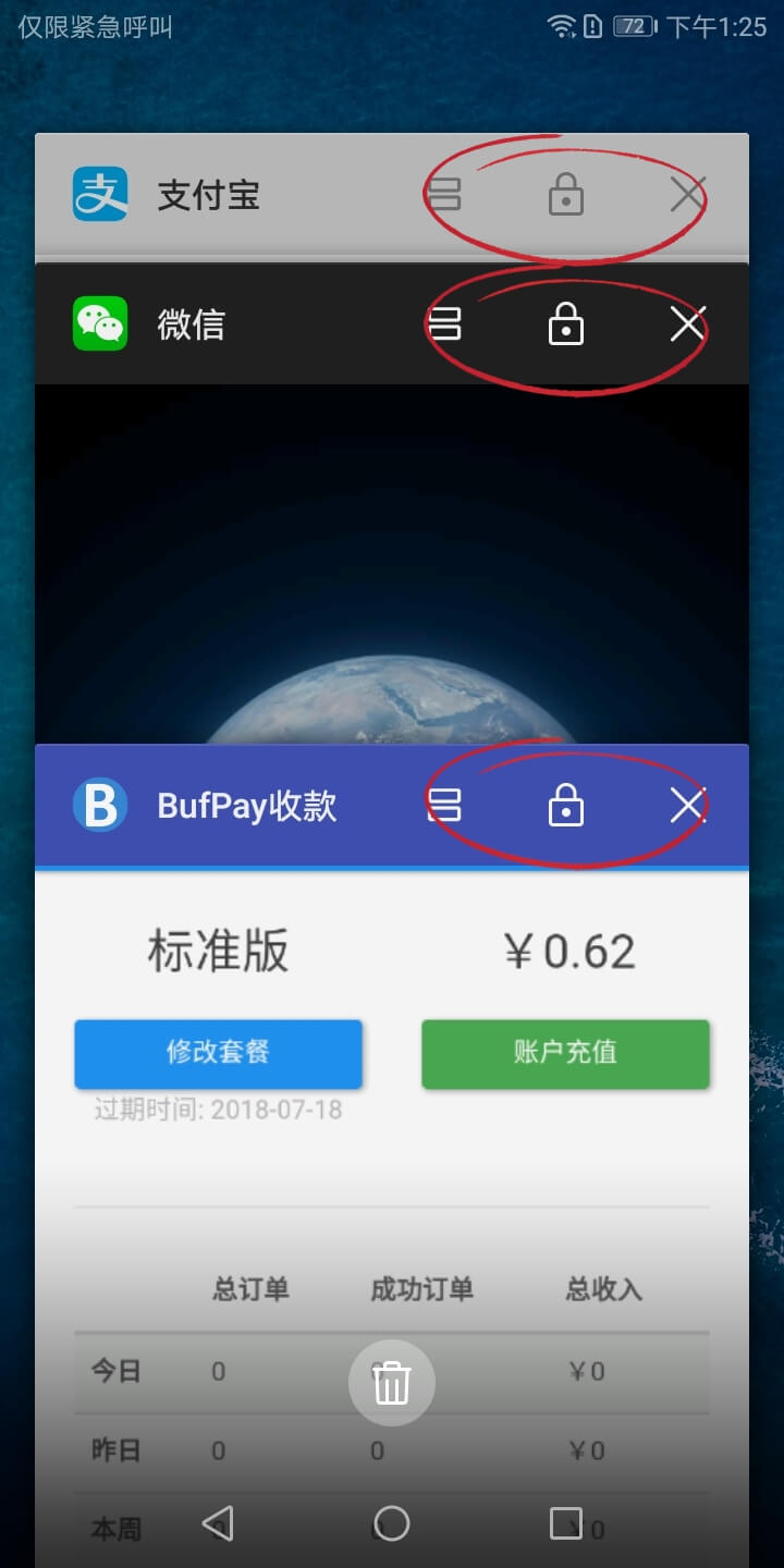 打开三个应用,然后按 设置键 呼出任务管理,点击锁定图标,锁定应用。