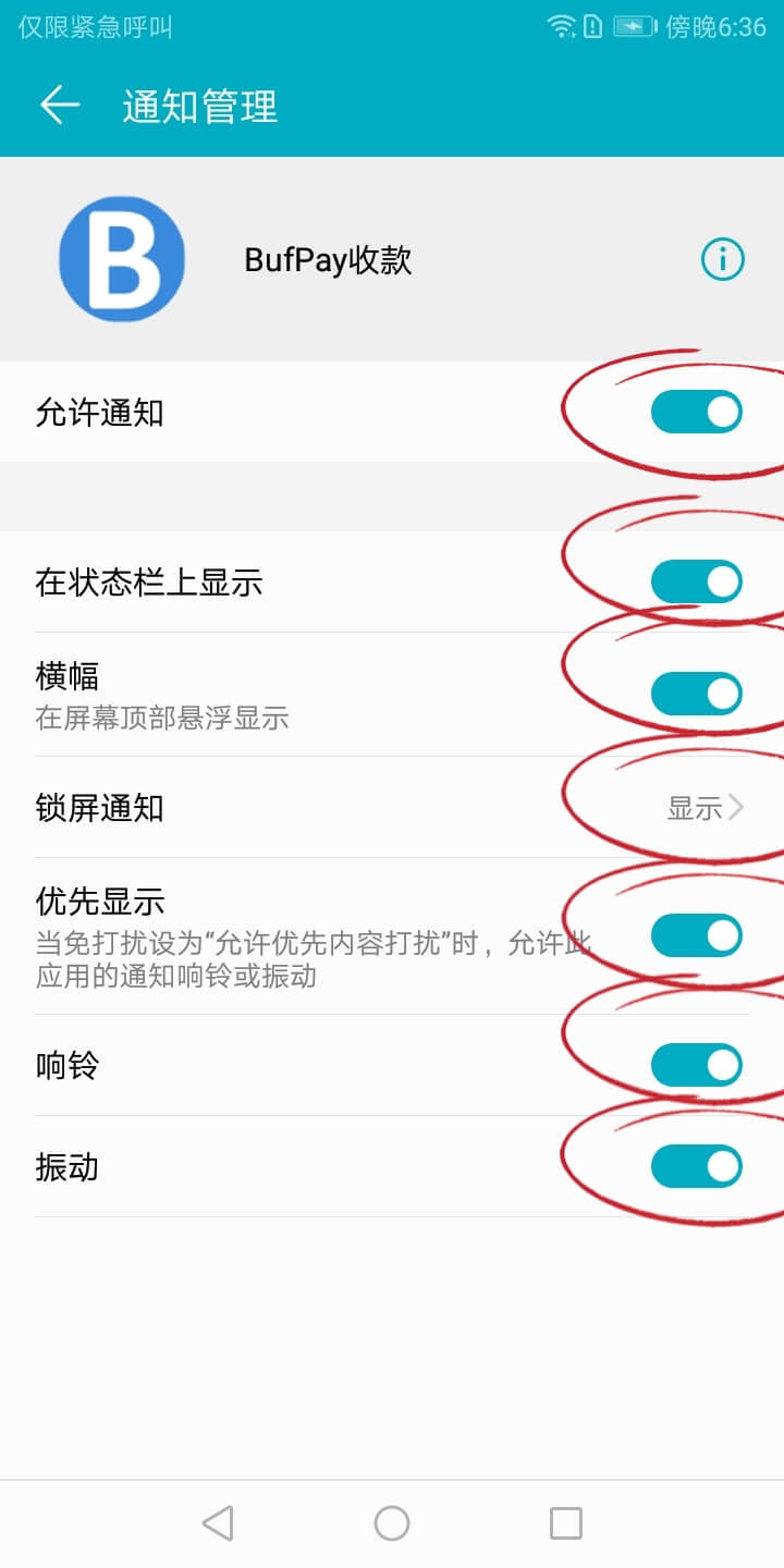 在系统「设置」-「通知和状态栏」-「通知管理」- 找到 BufPay收款、微信、支付宝 开启所有通知。