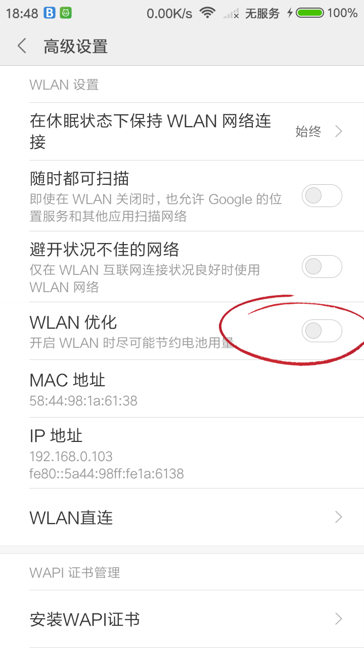 在系统「设置」-「WLAN」-「高级设置」- 关闭「WLAN优化」。