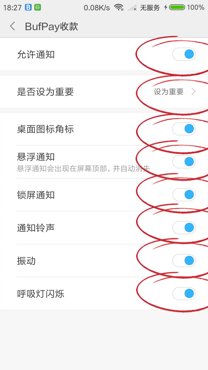 在系统「设置」-「应用程序」- 找到 BufPay收款、微信、支付宝 - 「通知」开启所有通知。