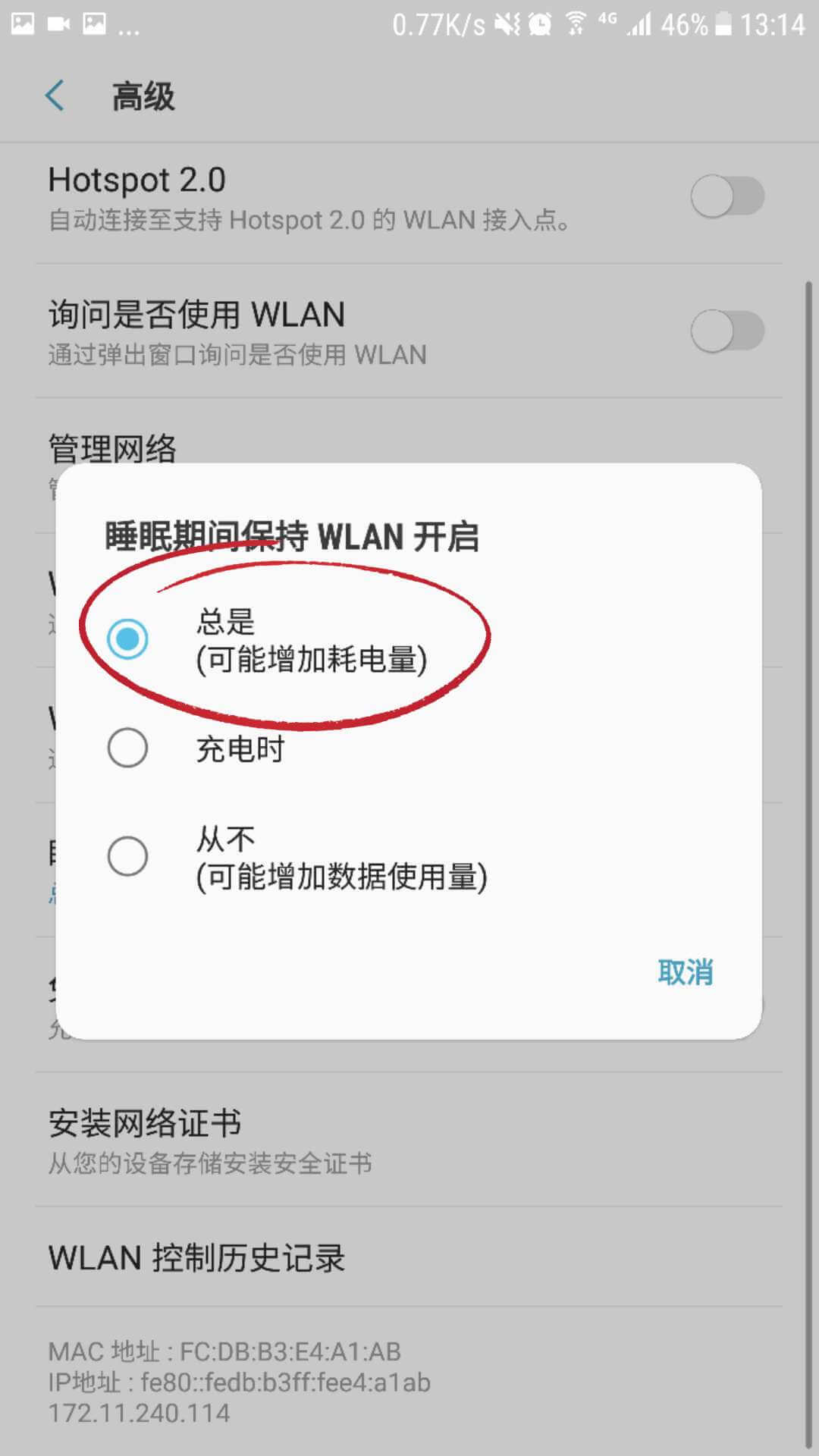 在系统「设置」-「无线和网络」-「WLAN」- 底部「设置」- 「在休眠状态下保存 WLAN 连接」选择始终。